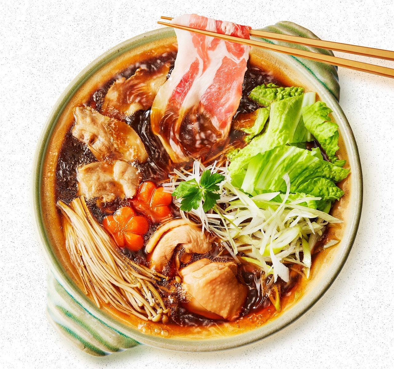 飯田商店は、2010年に神奈川県湯河原町で創業し、関東特有の“キレのある醤油感”を求め全国からラーメンファンが訪れる人気店です。『名店監修鍋スープ らぁ麺飯田商店鶏だし醤油味』は、飯田商店の店主・飯田将太氏監修のもと、同店の看板メニューのひとつである「しょうゆらぁ麺」を鍋スープとして再現し、鶏・アサリ・昆布・ホタテの旨みを加えた清湯(チンタン)仕立てのスープに、濃口醤油・淡口醤油・白醤油を合わせ、鶏油をバランスよく効かせたストレートタイプの鍋スープです。醤油感と鶏油のコクにあふれるスープは、鶏もも肉、豚しゃぶしゃぶ用うす切り肉、長ネギ、白菜、えのき茸、ニンジンなどの具材によく絡む“至福の味”です。鍋あとは、下茹でした中華麺とスープを合わせ、刻みネギとゆず皮をトッピングした「醤油らぁめん」で決まりです。