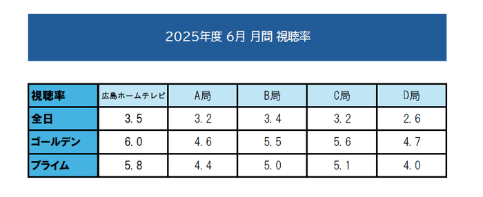 広島ホームテレビ(本社:広島市中区)は、2025年6月の個人全体の視聴率において、全日(午前6時~深夜0時)で平均3.5%、ゴールデンタイム(午後7時~10時)で平均6.0%、プライムタイム(午後7時~11時)で平均5.8%と、いずれも1位を獲得いたしました。