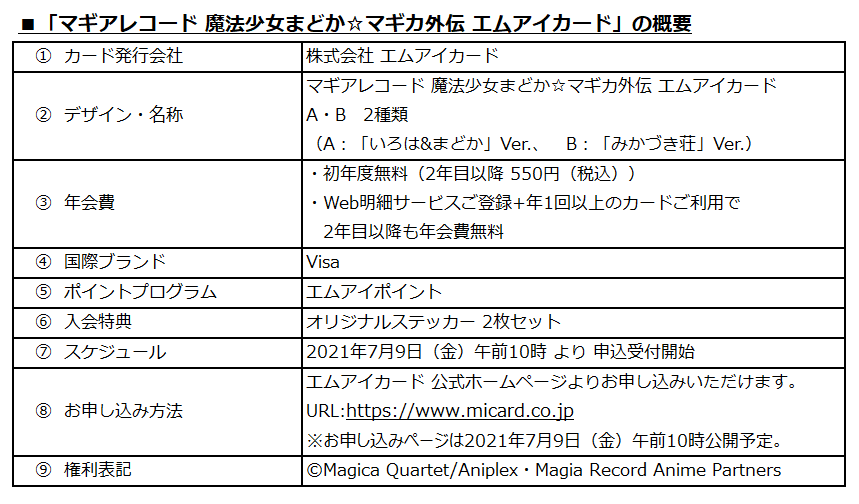 株式会社三越伊勢丹ホールディングス(本社:東京都新宿区、取締役 代表執行役社長CEO:細谷 敏幸)の子会社である、株式会社 エムアイカード(本社:東京都中央区、代表取締役社長執行役員:梅田 貴生)は、株式会社アニプレックス(本社:東京都千代田区、代表取締役:岩上 敦宏)とクレジットカードの発行について提携し、TVアニメ2nd SEASONの放送を記念して「マギアレコード 魔法少女まどか☆マギカ外伝 エムアイカード」の申込受付を2021年7月9日(金)より開始いたします。