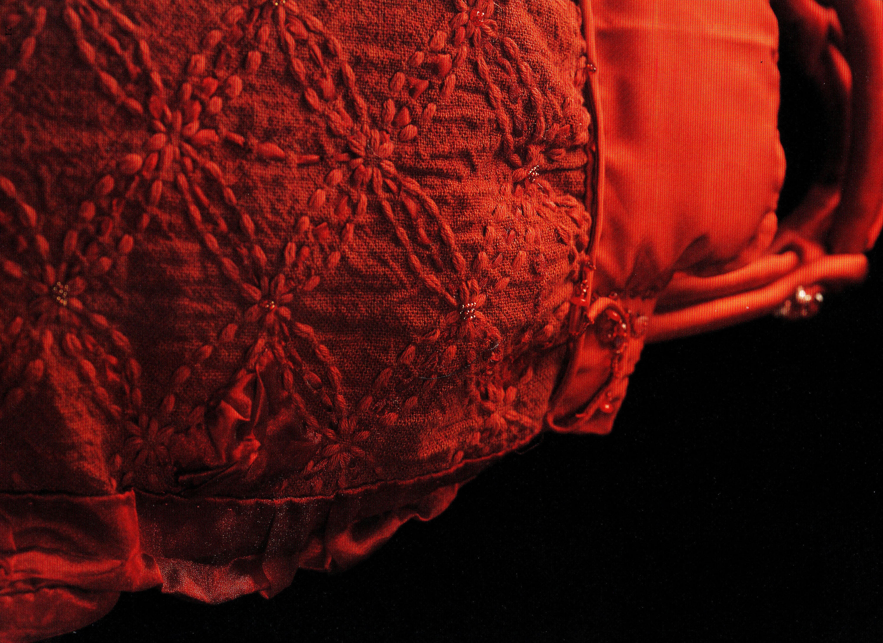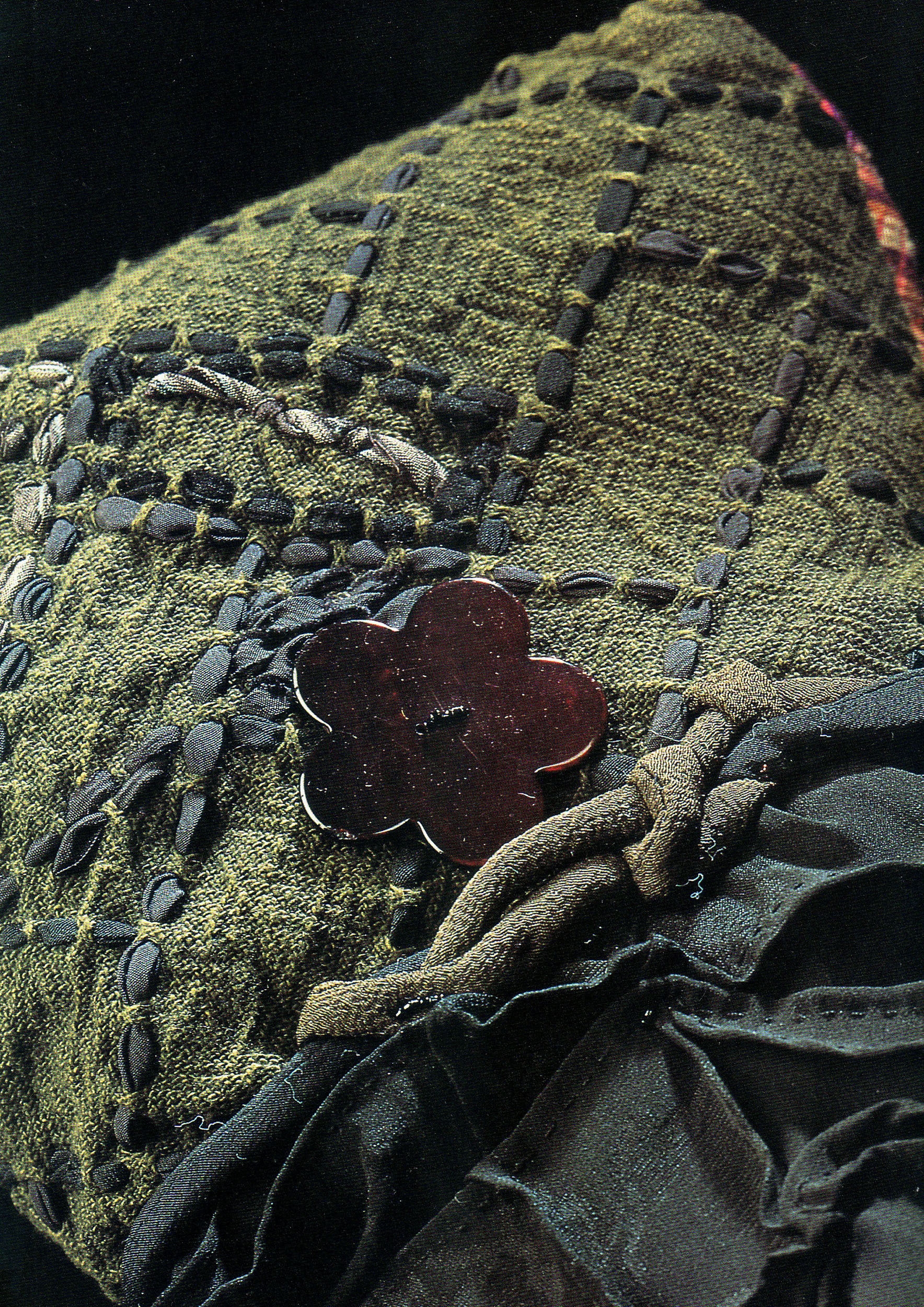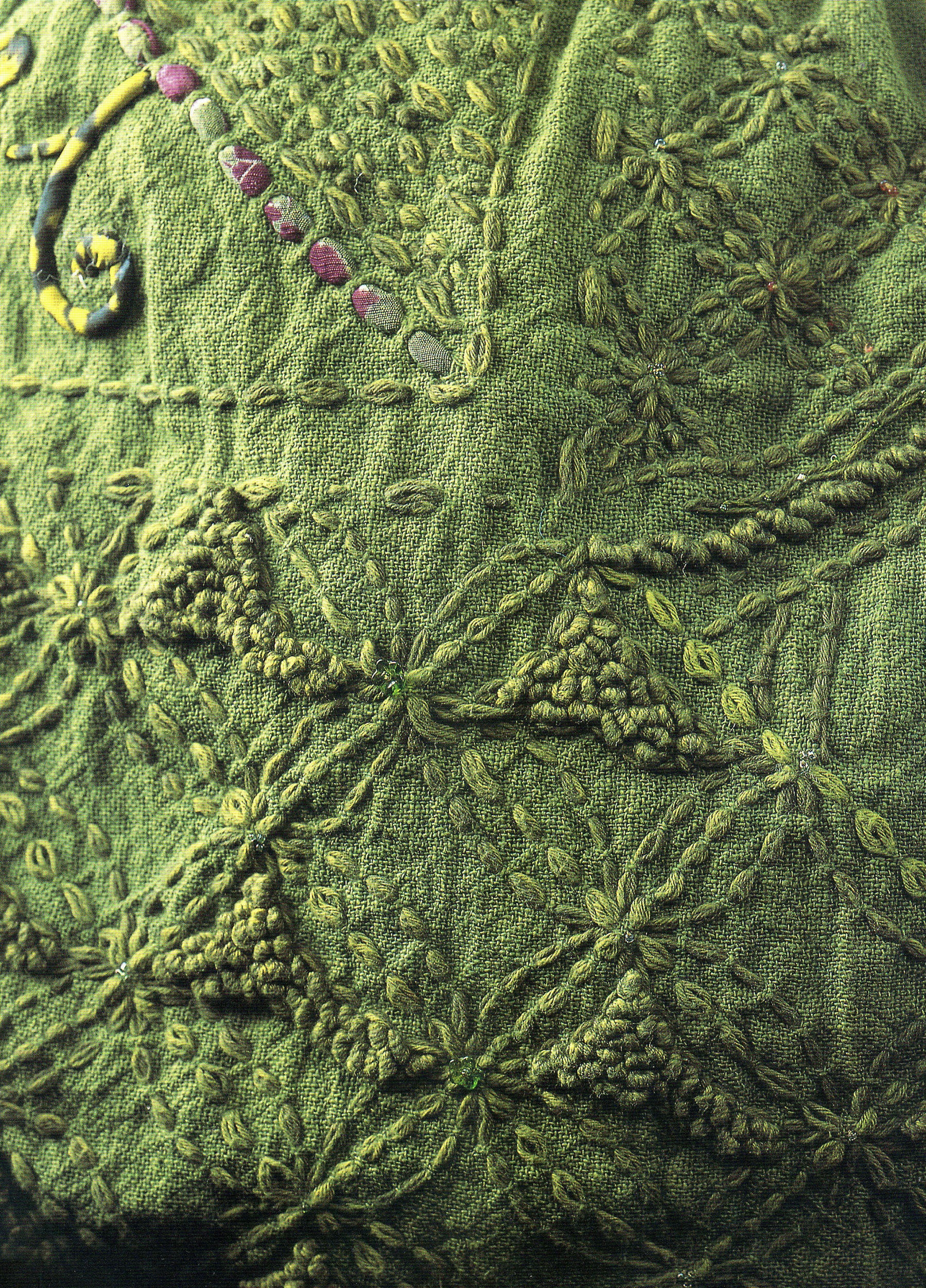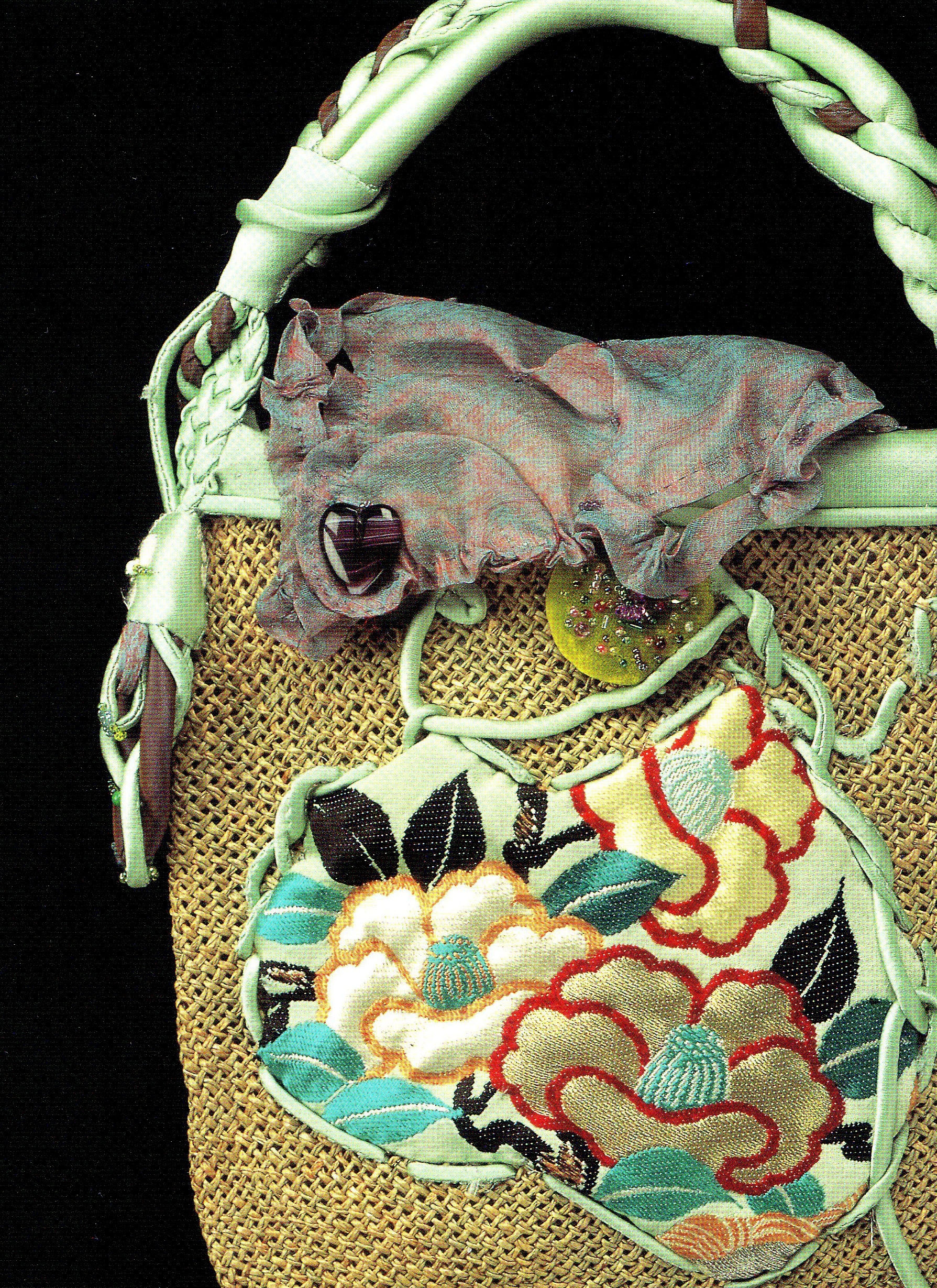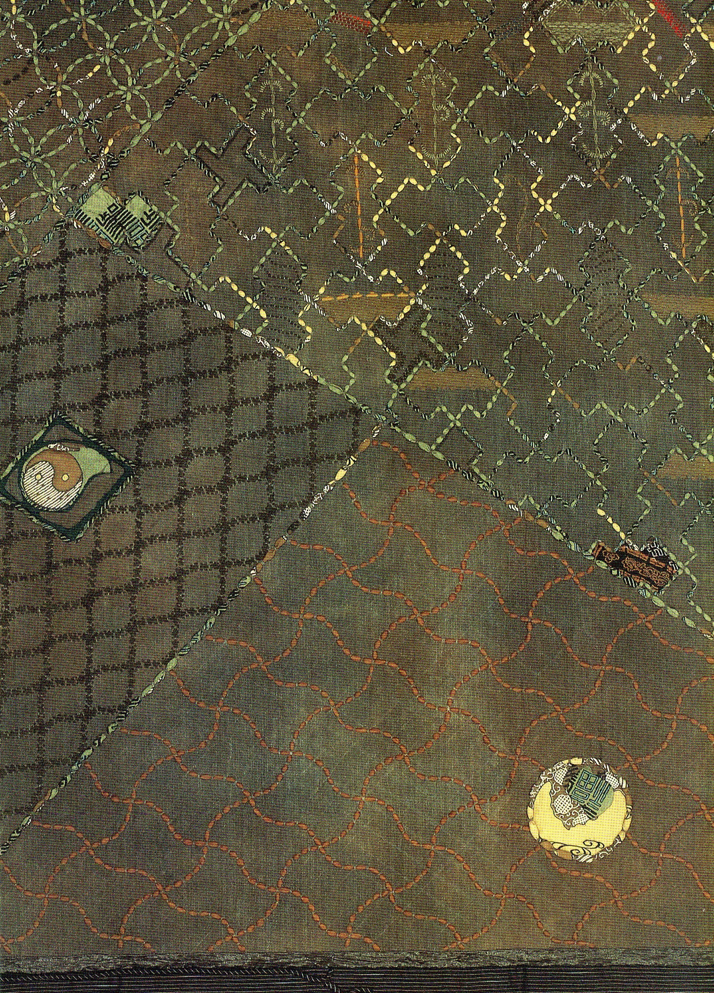 布をさいて、または細く切って、それを糸の代わりに使って刺し込んでいく独自の手法を見つけ、その方法を“天極縫い”と名づけました。“天極縫い”という、裂き布やループを布にひと針ひと針刺していくオリジナルの技法を使い、麻の葉や紗綾形といった日本の古典的な文様や、自らデザインした柄を様々なマテリアルと融合させながら独自のアート観を表現しています。