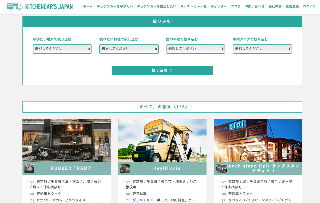 キッチンカーを探す側も、「営業可能地域」「食べたい料理」「国の料理」「車両タイプ」などから絞り込む事が可能なので、例えば「世界の食卓」のようなイベントを開催しようとした際も簡単にキッチンカーを選ぶ事が出来ます。