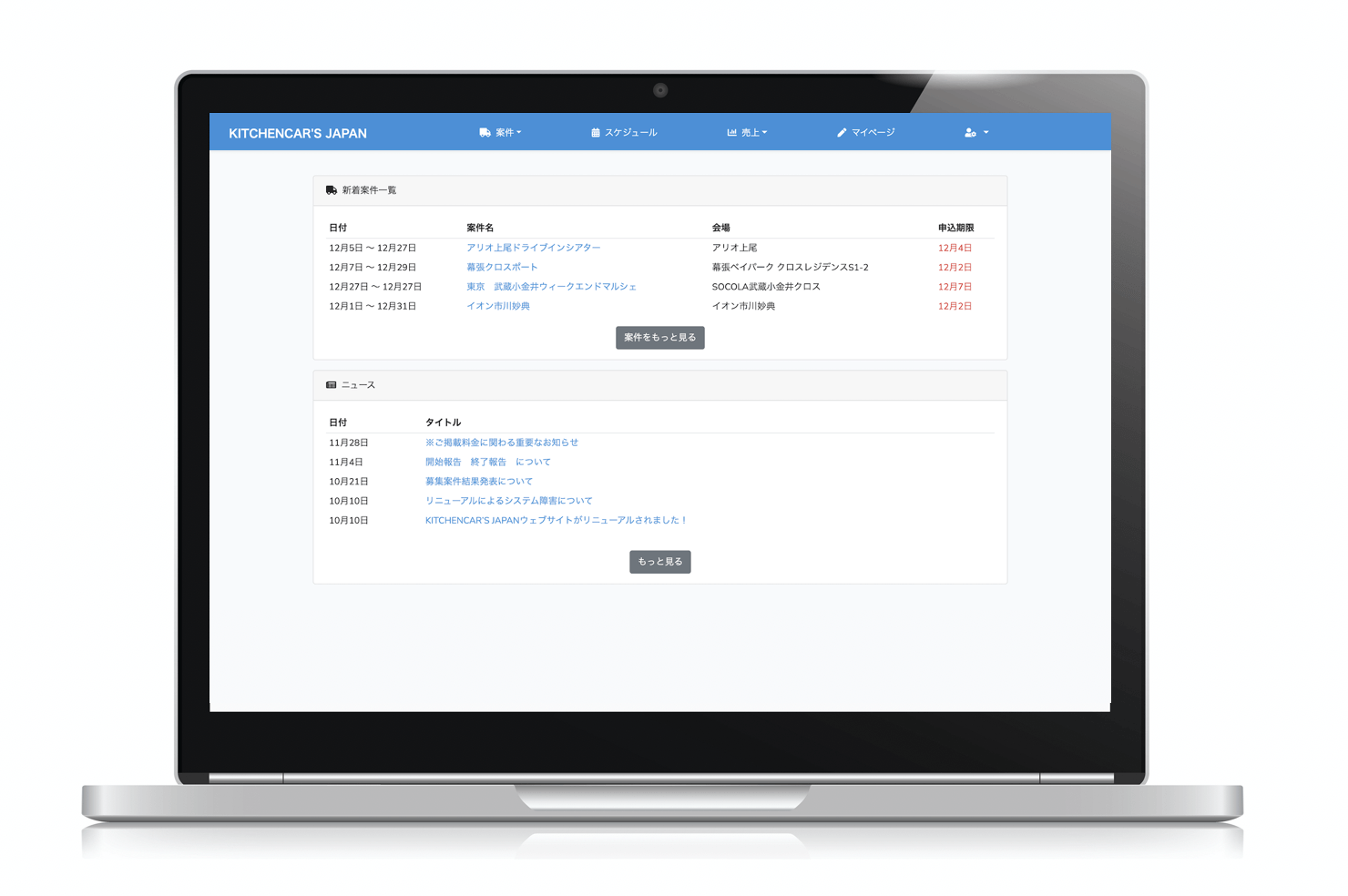 これまではシステム利用料、月額掲載費用などある程度の利用料が掛かっていましたが、2020年12月より大きく軌道を変え、売上管理、スケジュール管理、出店申し込みなど全てのシステム利用料及び月額掲載費用が無料になりました。