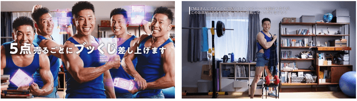 本CMには、なかやまきんに君さんが出演。CMでは3月18日(土)から開催する、5点売るごとに豪華景品が当たるくじ「ブッくじ」がもらえるキャンペ―ンにおいて、買取可能な対象商品のジャンルが多いことを表現するために、本やDVD、ゲームなどを持った5人のきんに君さんが出現します。5人のきんに君さんが中央のきんに君さんに吸い寄せられると、いきなり爆発し、1枚の「ブッくじ」に変身。展開が早すぎる動画となっています。きんに君さんの驚いた表情や動きにご注目ください。爆発後の破れたタンクトップ姿は必見です。