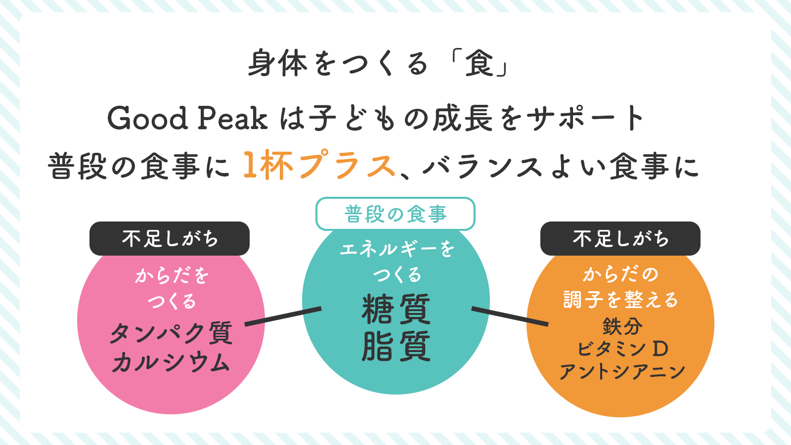 【GOOD PEAK】には子どもにとって必要な栄養、不足しがちな栄養がぎゅっと詰め込まれています。
