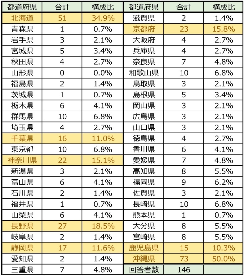 ・「沖縄県」(50.0%)、「北海道」(34.9%)、「長野県」(18.5%)で、観光地としても有名な道県が上位です。