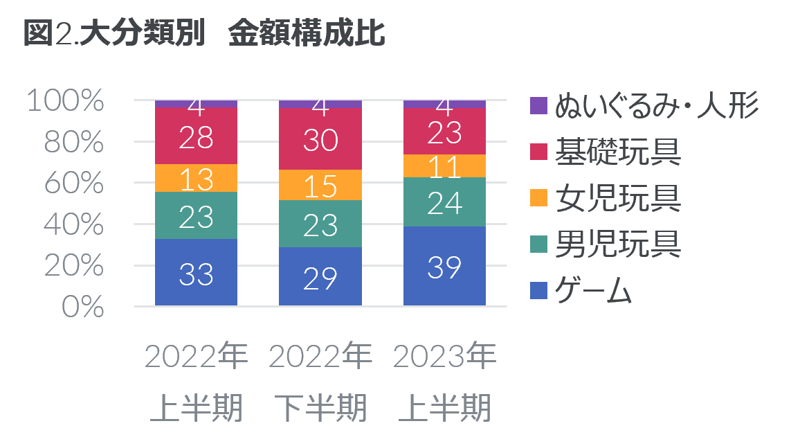 大分類別にみると、2022年に引き続きトレーディングカードの販売が伸びた「ゲーム」の金額は34%増と、今期も純玩具全体の金額拡大をけん引した。大分類ゲームが玩具全体に占める金額構成比は、前年同期から6%ポイント拡大し約4割に達した(図2)。「ぬいぐるみ・人形」は、純玩具に占める構成比は4%と小さいながらも、「ポケットモンスター」や「ちいかわ」のアイテムが好調に販売を伸ばしたことなどにより、金額が21%増となった。「男児玩具」は、上半期としては2019年以来4年ぶりのプラス成長となった。「仮面ライダーシリーズ」や「ウルトラマン」などの男児キャラクター関連では、テレビ連動商品やソフビ人形の販売が好調に推移した。ガンダムや仮面ライダーとのコラボレーションが話題となった「トミカ」や映画コンテンツとのコラボレーション商品を多く展開する「ホットウィール」などが含まれる「ミニカー」は、金額前年比が23%増となるなど、男児玩具の金額拡大を後押しした。