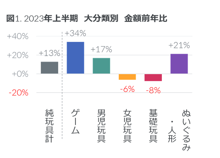 ・2023年上半期の玩具販売額は前年比13%増。2022年に引き続きトレーディングカードの販売が大きく伸びた大分類「ゲーム」が市場拡大をけん引。「男児玩具」「ぬいぐるみ・人形」も金額増加に貢献。