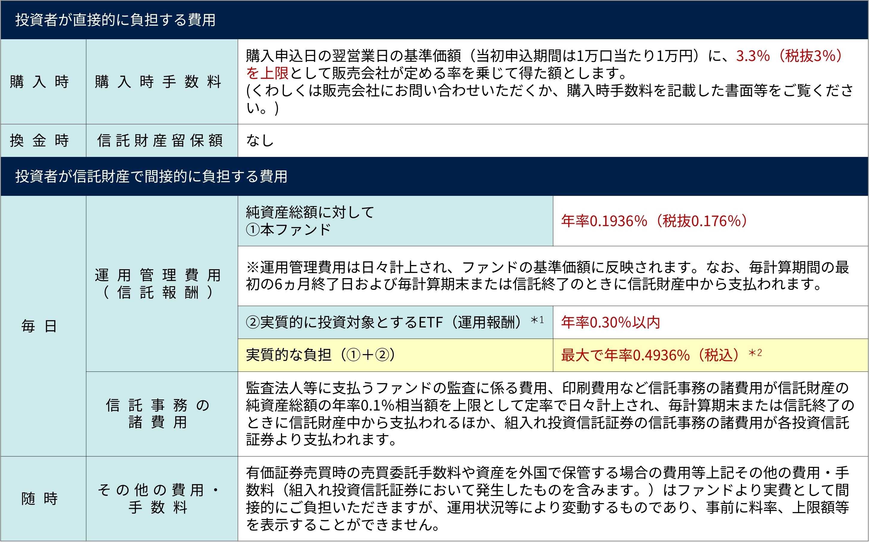 *1 ETFにかかる信託事務の処理等に要する諸費用等を含みます。実質的に投資対象とするETFの運用報酬は各ETFにより異なります。くわしくは、投資信託説明書(交付目論見書)の「主な投資対象」をご覧ください。