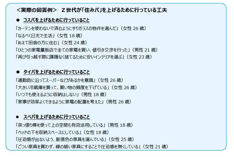Z世代が「住みパ」を上げるために行っている工夫を自由回答で聞いてみると、コスパを上げるために、「なるべく日光で生活」(女性18歳)などの光熱費を抑える方法や、「ひとつの家電量販店で全ての家電を買い、値引き交渉を行った」(男性21歳)のような、まとめ買いでお得に購入をしている様子も見られました。
