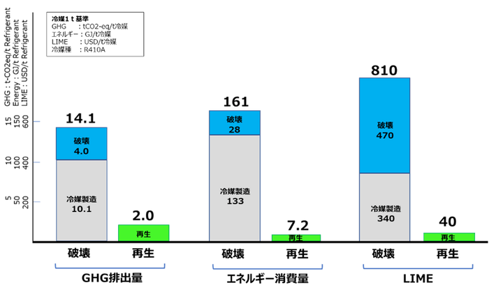 ・日本においてR410Aを再生処理する場合、破壊処理する場合と比較してGHG排出量約1/7、エネルギー消費量約1/25、LIME約1/20の値となった