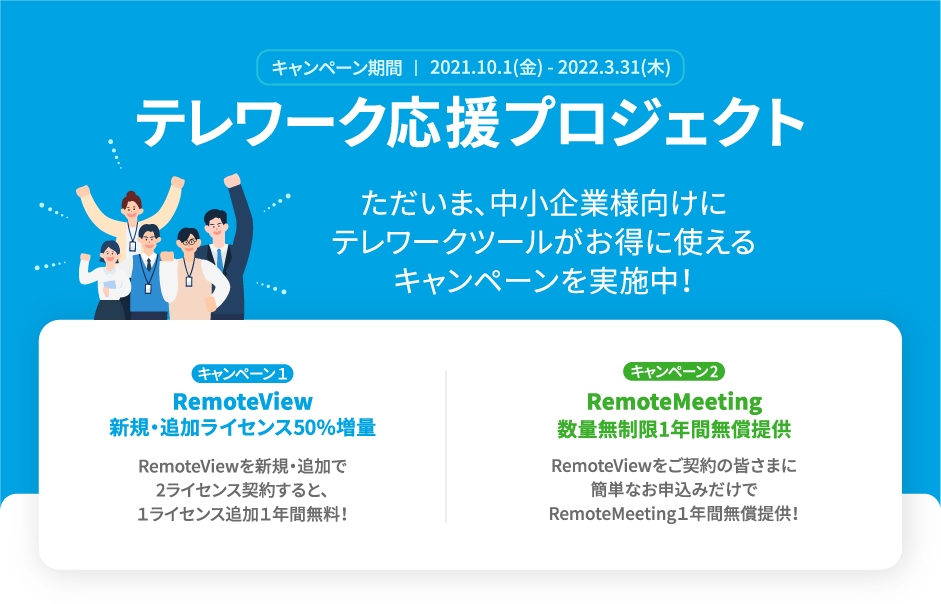 本キャンペーンは、RemoteViewのライセンス契約をすると、追加で契約数の半分のライセンスを1年間無償提供及びWeb会議システムRemoteMeetingを1年間無償提供する内容となっています。