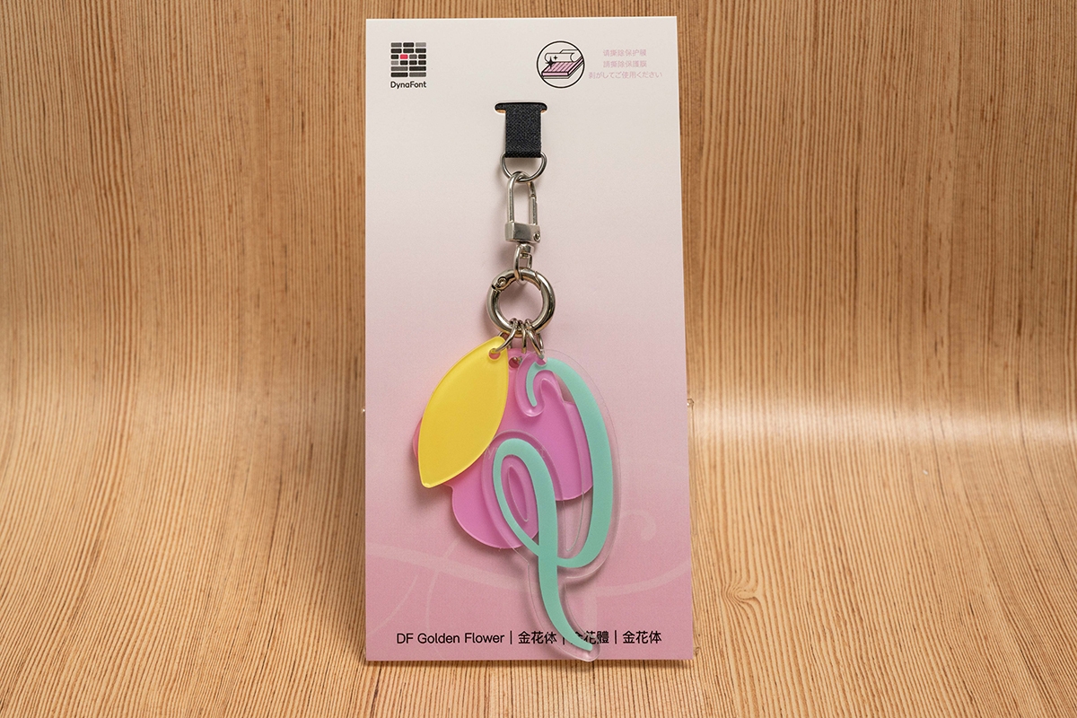 「ダイナフォント金花体キーホルダー」は、2024年7月に中国・上海で開催したダイナコムウェア「文字より新生へ」芸術展のオリジナルグッズとして制作、「文字より新生へキーホルダー」をリデザインした2種類のキーホルダーです。ダイナコムウェアを代表する書体デザイナーであるOliveがデザインした特別な瞬間を祝福する文字「金花体」のビジュアルを採用しており、アクリルの保護フィルムを剥がすことで光沢が出て「金花体」の華やかさをより味わうことができます。