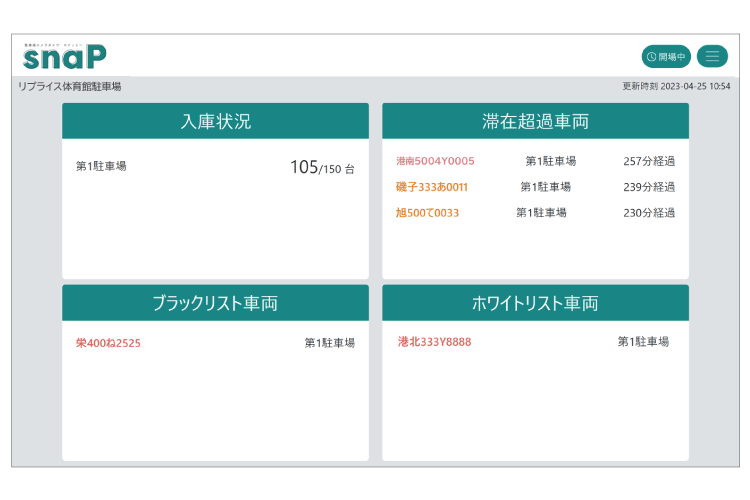 入庫状況のほか、あらかじめ設定した滞在可能時間を超過した車両やブラックリストのナンバー、ホワイトリストのナンバーに該当する車両も表示されます。