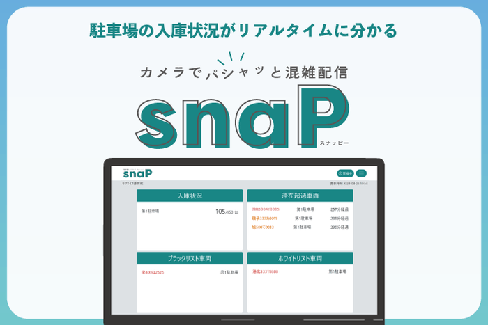 snaP(スナッピー)は、駐車場出入口に設置したナンバープレート認識カメラで撮影したナンバープレートの情報を解析し、現在の入庫台数をWeb上でリアルタイムに見える化するサービスです。