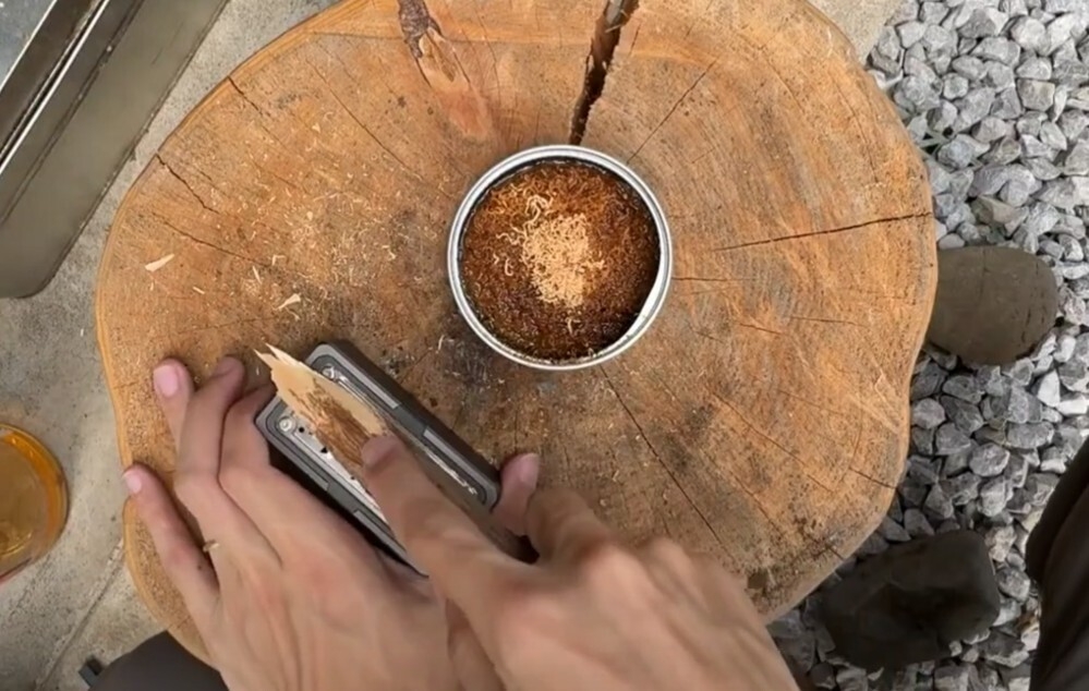落ちている枝をシュッシュッと軽く削るだけで、着火しやすい火口に変身させる道具です。