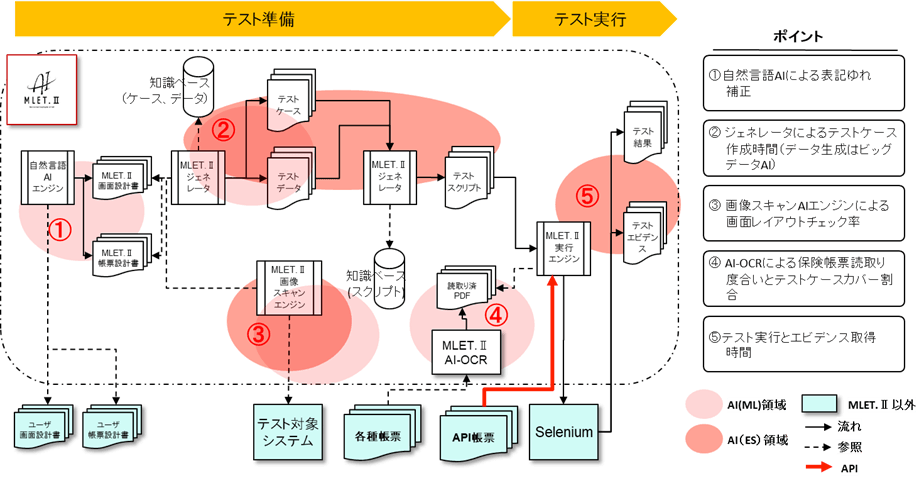 「MLET.II」はこれまで手作業で作っていたテストシナリオ、テストスクリプト、テストデータが自動で出力され、テスト自動実行ツールへも自動連係するAIアプリケーションです。