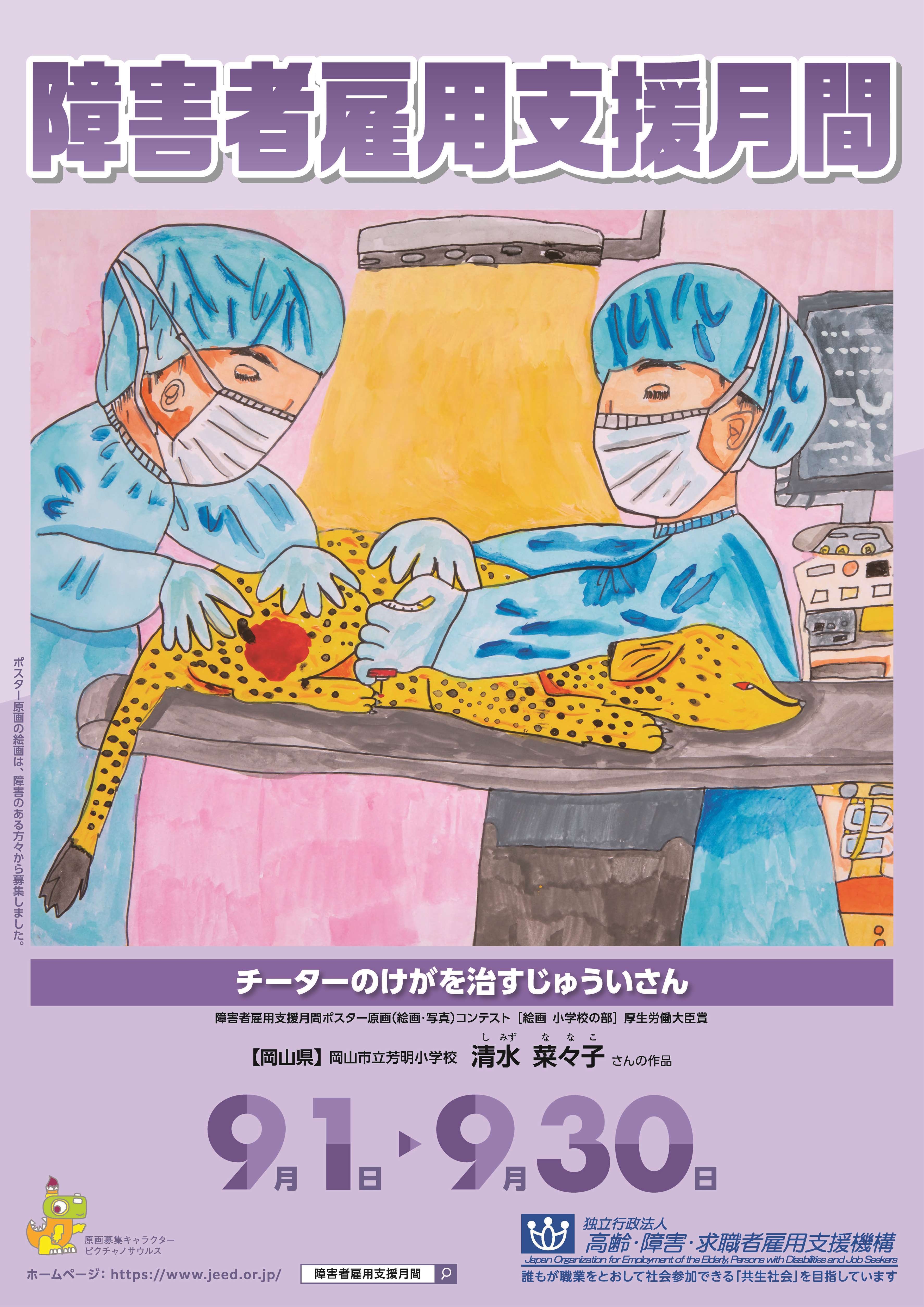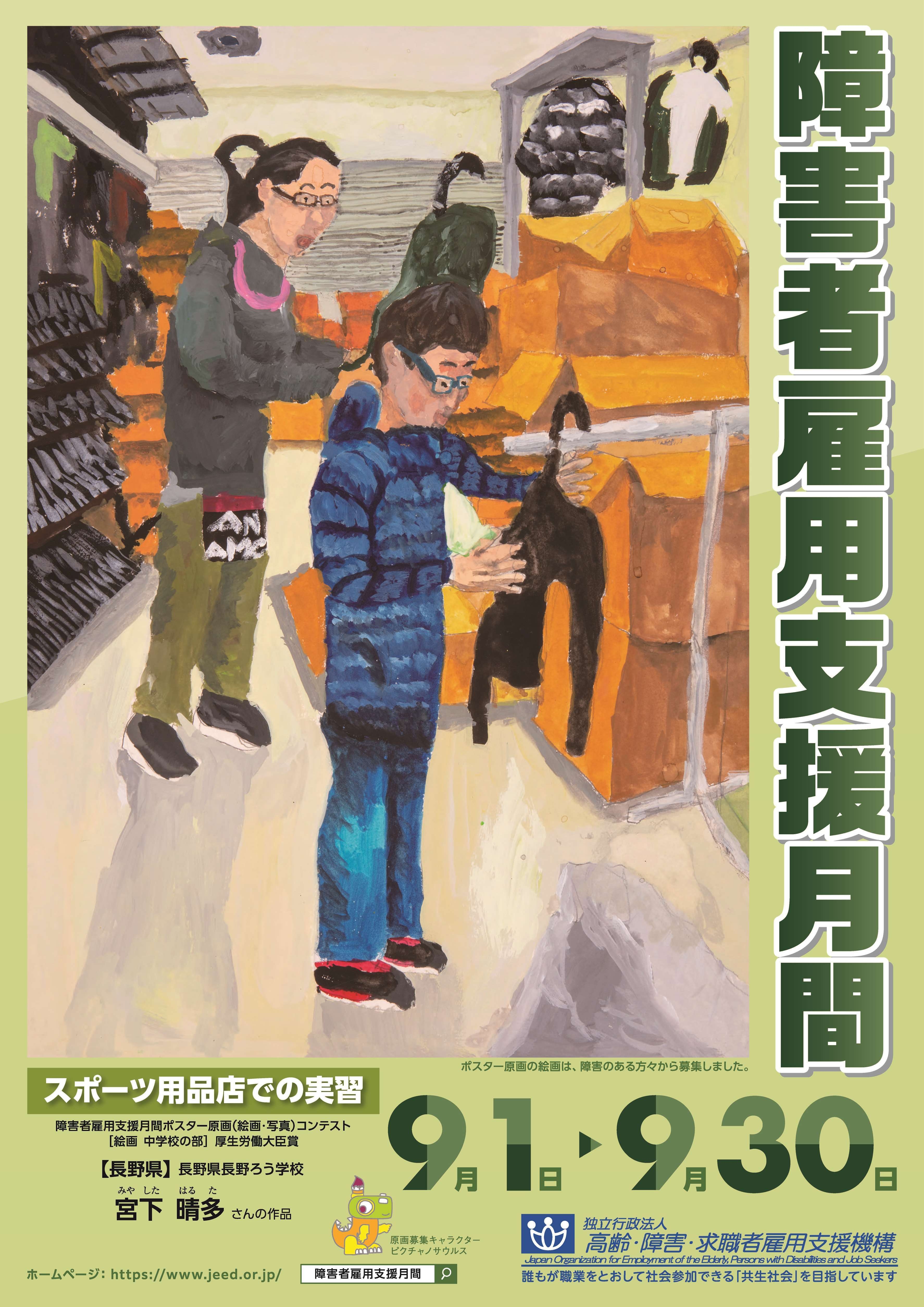 9月は障害者雇用支援月間です。当機構では、障害者雇用への理解と関心を深めていただくため、毎年、働くことや仕事に関係する内容の絵画及び障害のある方が働いている姿を撮った写真を障害のある児童・生徒をはじめ広く募集し、その優秀作品をもとに障害者雇用支援月間のポスターを作成、掲示しています。