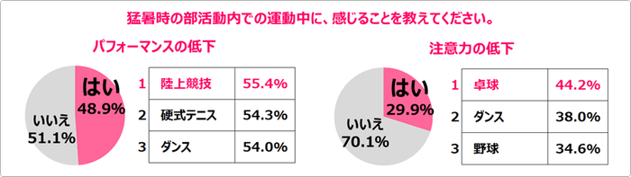 猛暑時の部活「パフォーマンス低下」5割、「注意力低下」3割 /「パフォーマンス低下」:1位「陸上競技」、2位「硬式テニス」