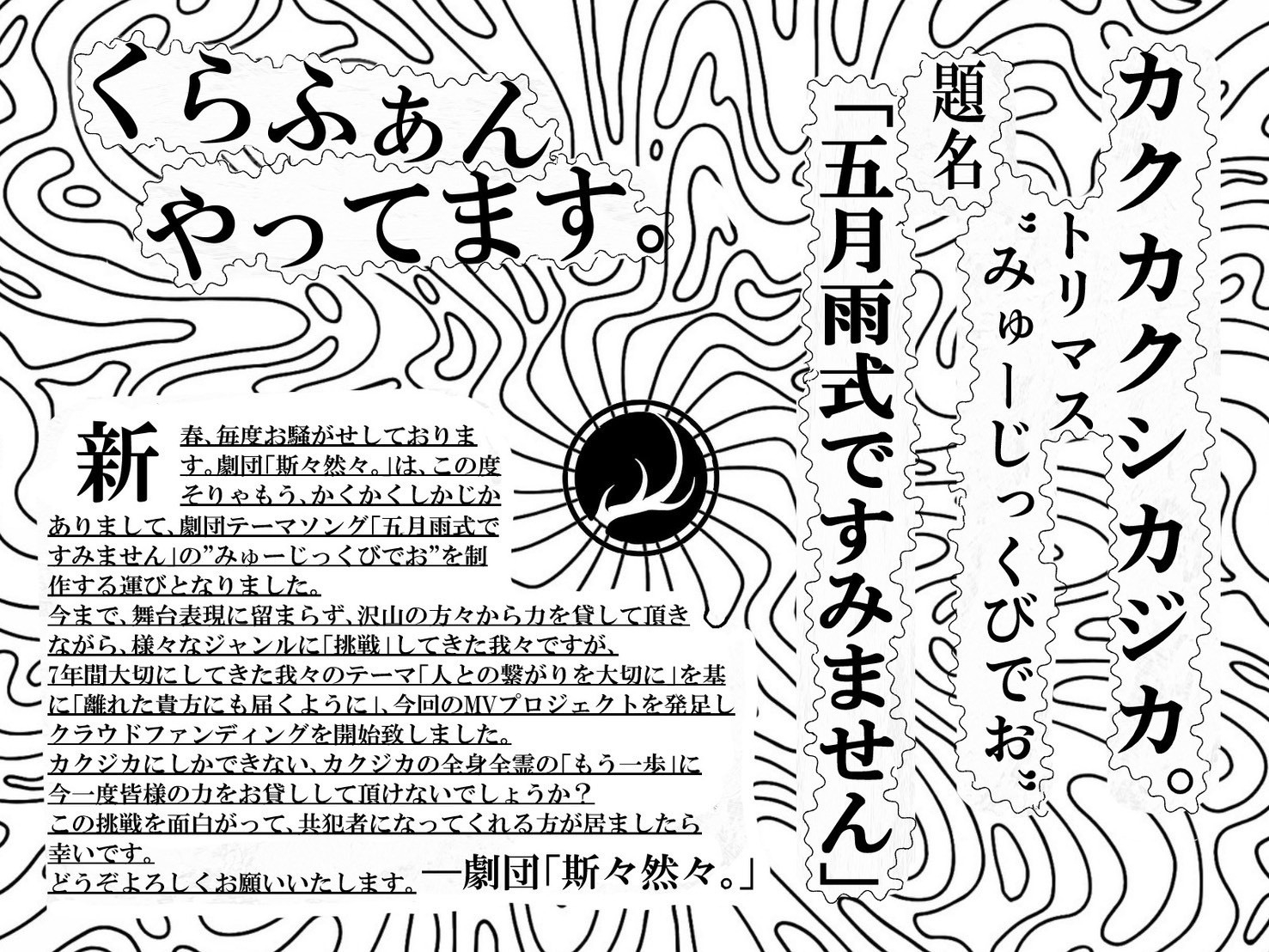 2018年2月に旗上げし、これまで舞台表現のみならず様々な表現活動に挑戦してきた、男9人劇団「斯々然々。」が今回劇団テーマソング「五月雨式ですみません。」のMV制作プロジェクトをクラウドファンディングサイト「モーションギャラリー」にて1月16日より開始しています。