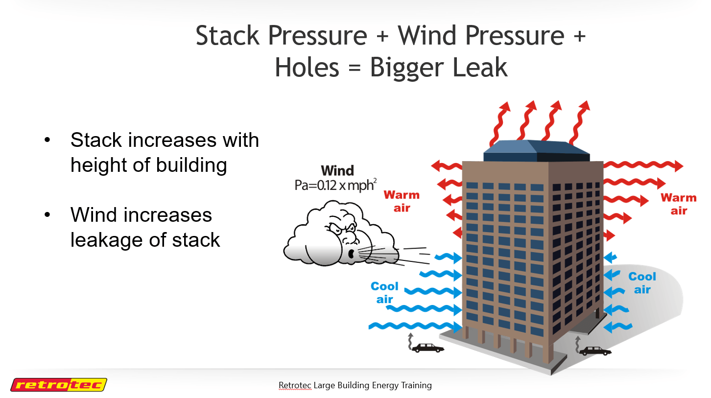 一般的に気密性能を向上させると、(1)エネルギーロスの削減、(2)室内快適性の向上、(3)汚染物質除去効率の向上、(4)壁内結露抑制による建物耐久性の向上、以上の4つの効果があるとされています。特に大型建築ほど都市部などの交通量の多い場所に計画されるため周辺の空気の清浄度も低い傾向にあり、気密性能が低いとフィルターを介さずにそうした排気ガス混じりの空気を室内に引き込むリスクが高まります。また大型建築においては、建物の高層化による煙突効果の増加と高層部の風速増大により、低層建築よりも室内外の差圧が大きくなり漏気量も増大する傾向にあるため、気密性能が低いことで生じるリスク(汚染空気の流入、壁内結露の発生など)がより高いといえ、建物の健全性や利用者の健康を守るためにも気密性能は重要になります。