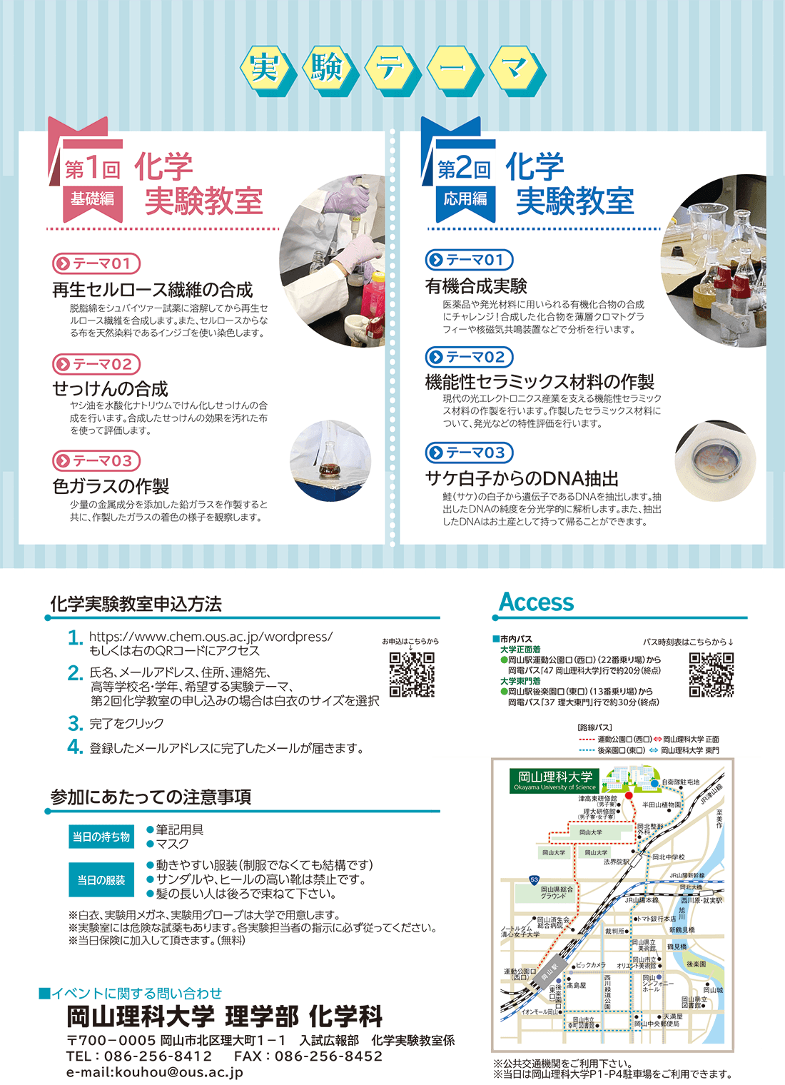 岡山理科大学理学部化学科では、今年度も化学実験教室を2回にわたり開催致します。
