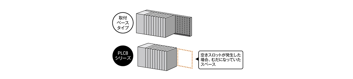必要な入出力カードのみでシステムを構築できるため、従来の取付ベース型で発生しがちだった空きスロットのむだなスペースを削減します。
