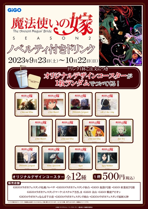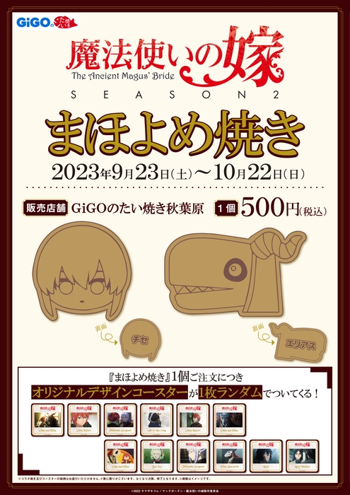 また本イベントの開催を記念して、GiGOグループ店舗(一部店舗を除く)では、『妖精テーマパークへの修学旅行』がテーマの新規描きおろしイラストを使用したイベント限定グッズの販売や、GiGOのお店限定景品を展開するとともに、GiGOのたい焼き秋葉原にて「まほよめ焼き」と、全国10店舗で『魔法使いの嫁SEASON2』のシーンカットコースターがもらえる、「ノベルティ付きドリンク」を販売いたします。