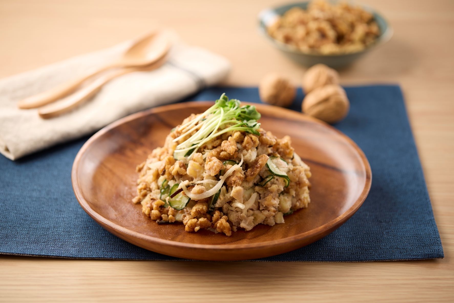 今注目のプラントベースとは、植物由来の食材を積極的に摂る食事法のことです。野菜や果物、豆類、穀物、ナッツなどを主に摂取しますが、動物性の食材を一切摂取しないビーガンやベジタリアンと異なり、プラントベースでは厳格な決まりがありません。そのため、植物由来の食材中心にしつつも、魚や肉類も柔軟に摂ることができます。オメガ3脂肪酸やたんぱく質、食物繊維など豊富な栄養を含むくるみは、100%植物由来のプラントベース食材。くるみ特有の歯ごたえはしっかりとした満足感を与えてくれるため、そぼろやハンバーガーなどの代替肉にも最適です。