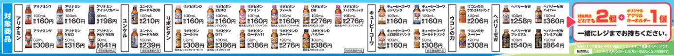 期間中、対象のドリンク剤を2個購入毎に、キャンペーン限定の「アクリルキーホルダー」よりお好きな絵柄を1個もらえます。本キャンペーンで初登場のかわいいうまミニをデザインに使用。