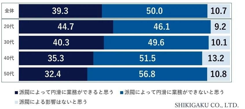 内訳を見てみると、「派閥によって円滑に業務ができると思う」と回答したのは39.3%で、「派閥によって円滑に業務ができないと思う」が50.0%、「派閥による影響はないと思う」は10.7%という結果でした。
