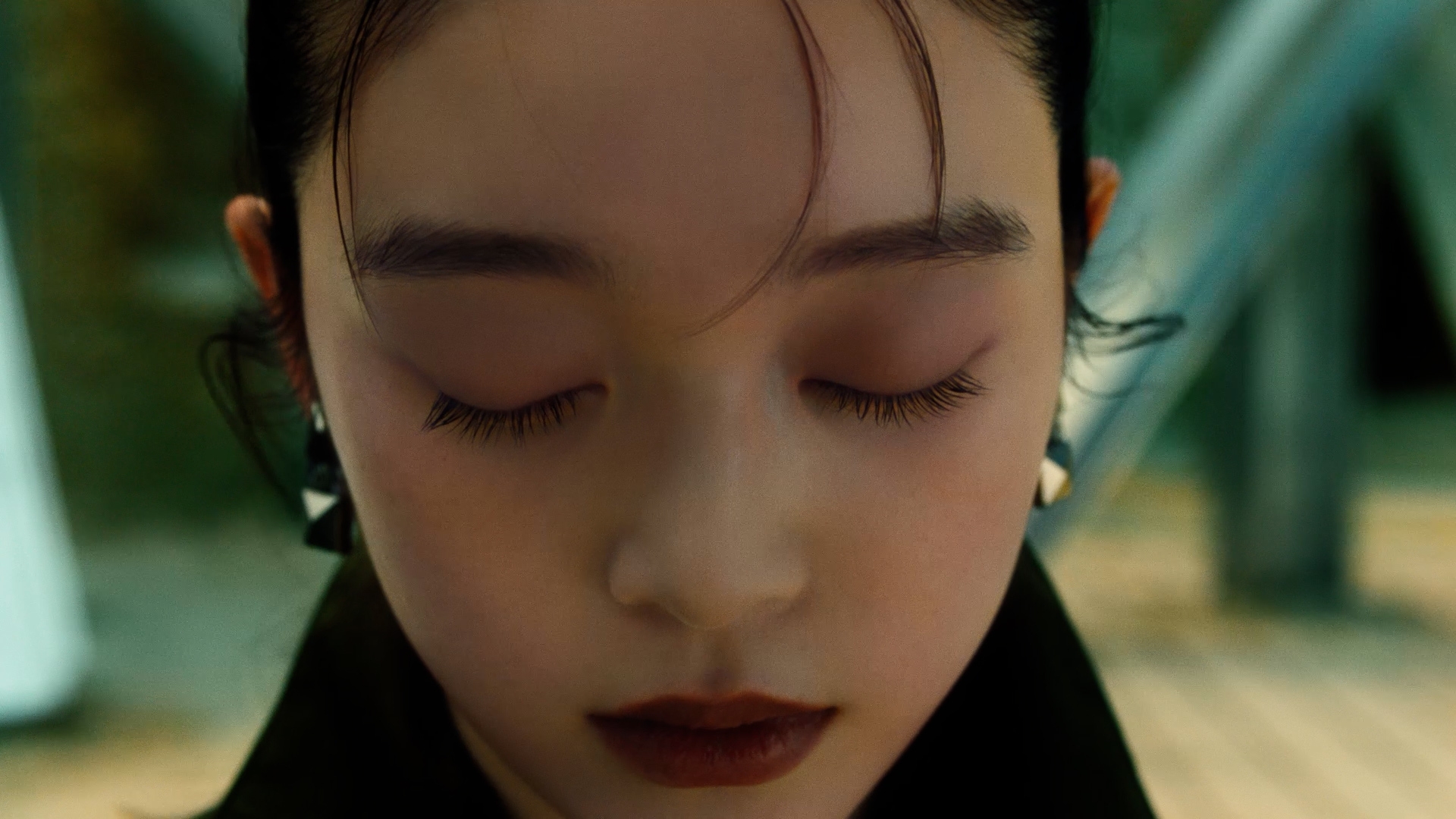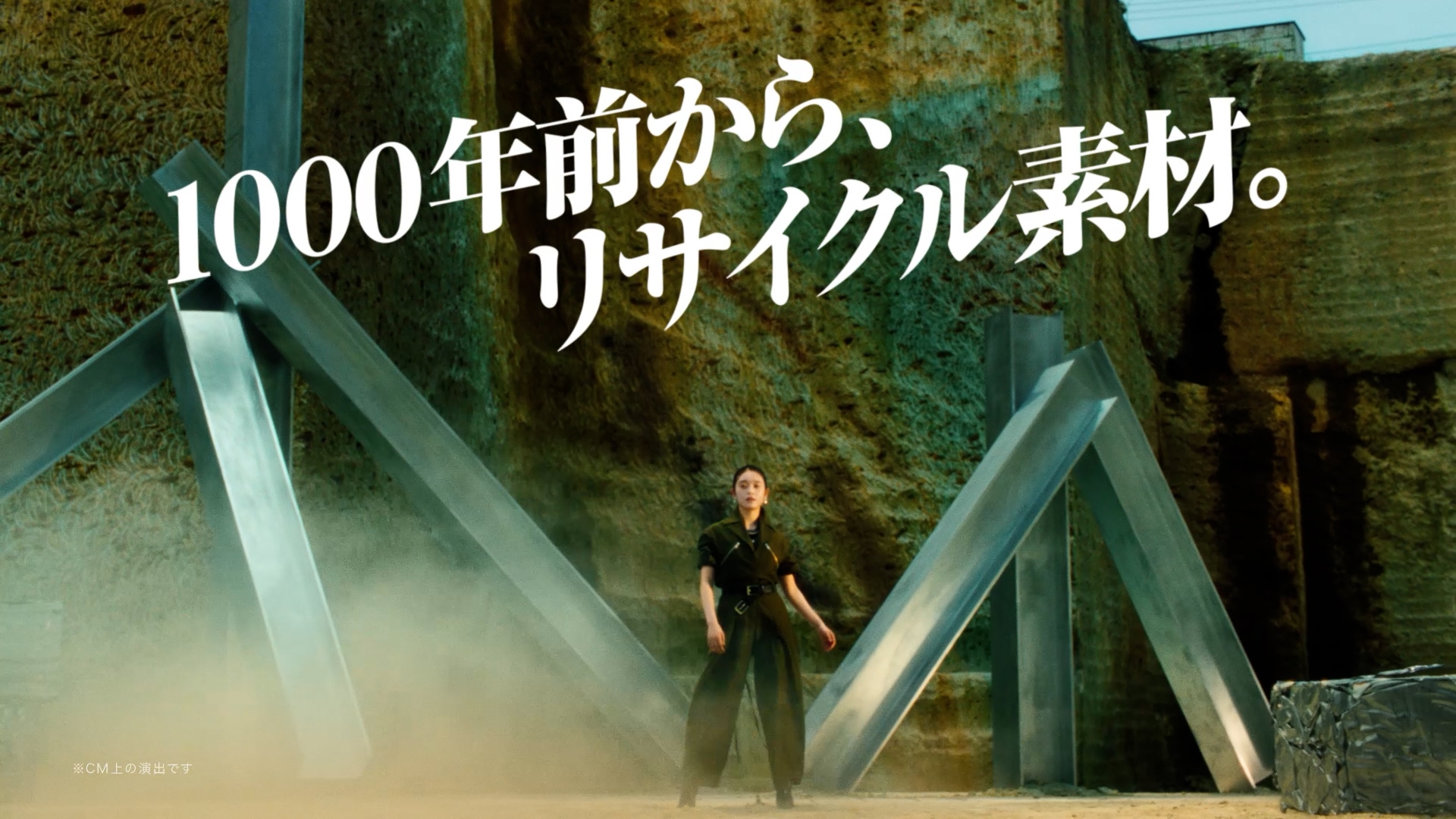 目を閉じ「リサイクル素材ってなんだと思う?プラ?紙?」と問いかける髙石さん。「いや、鉄でしょ」のセリフとともに現れるH形鋼のオブジェ。そこに「1000年前から、リサイクル素材。」のコピーが印象的に入ります。