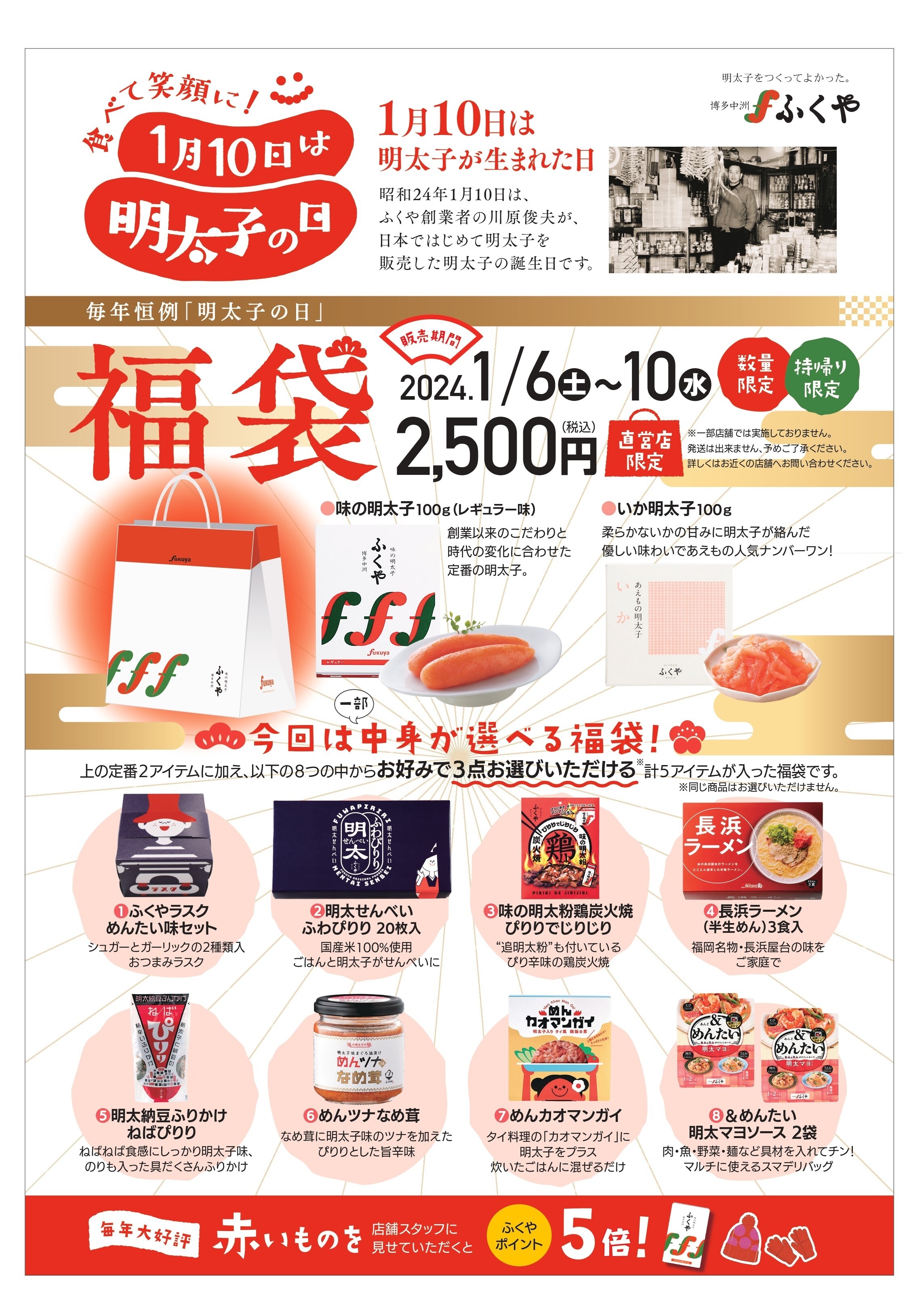 イベント限定の福袋、ふくやが運営する業務用スーパー「たべごろ百旬館」の明太子たっぷりおにぎり、石村萬盛堂のいちご大福、明太フランス など