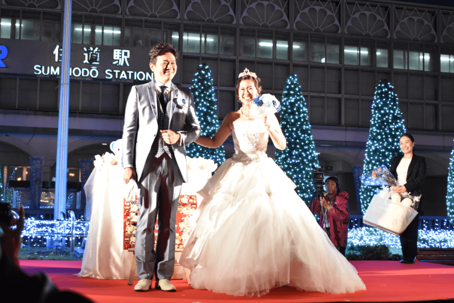 「大東市スマイルミネーション」では、「大東でしか体験できない、笑顔と幸せに満ちたイルミネーションイベント」をめざして、結婚する人も、立ち会う人も、偶然そこを訪れた人も、みんなが幸せになるスマイルウェディングを実施。