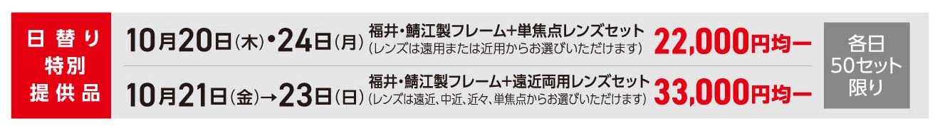 福井・鯖江製フレーム+レンズセットを各日50セット限り、お買得な均一価格にてご用意いたします。また、有名ブランドサングラス各種が特別価格、ジュエリー・ゴールドフレーム+遠近両用レンズセットなどラグジュアリーフレームもお買得なセット価格にてご用意いたします。