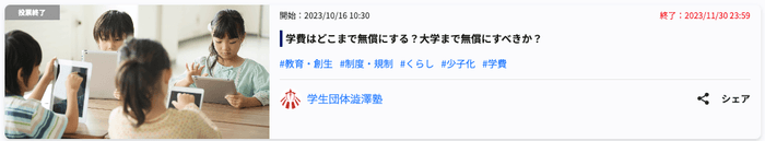 SNSとテクノロジーで社会課題の発見・解決をサポートするPolimill株式会社(ポリミル、本社:東京都港区、代表取締役:横田えり、以下Polimill社)はこのたび、「学費はどこまで無償にする?大学まで無償にすべきか?」というイシュー(課題)について11月30日に投票が終了しましたので結果をお知らせします。