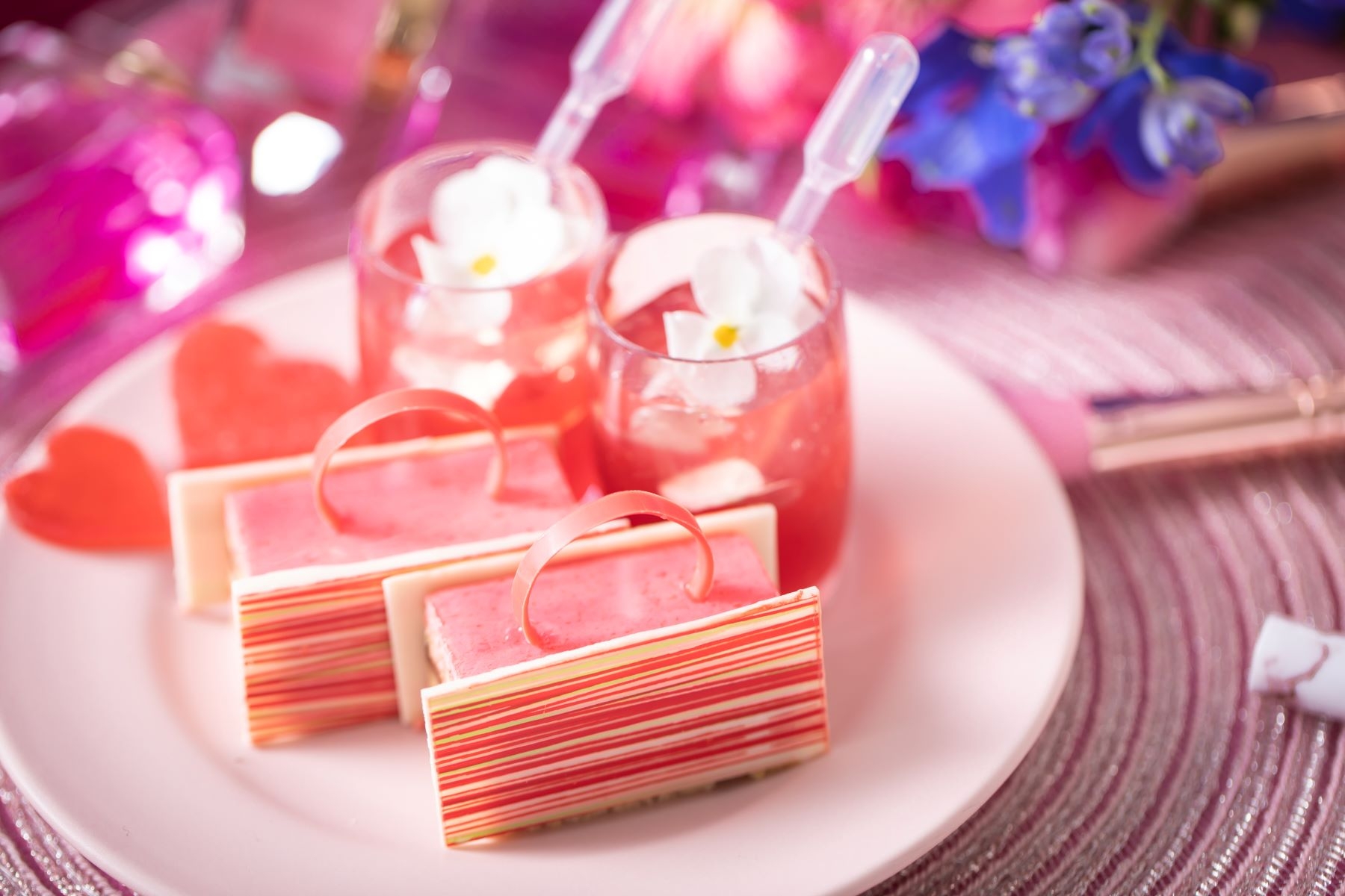 メインのスイーツスタンドは、ピンクカラーで統一し、大人かわいい女性を表現するため“ティアラやバッグ、リング”などのファッションアイテムをスイーツのモチーフに取り入れ、細部まで趣向を凝らしたスイーツに仕上げました。