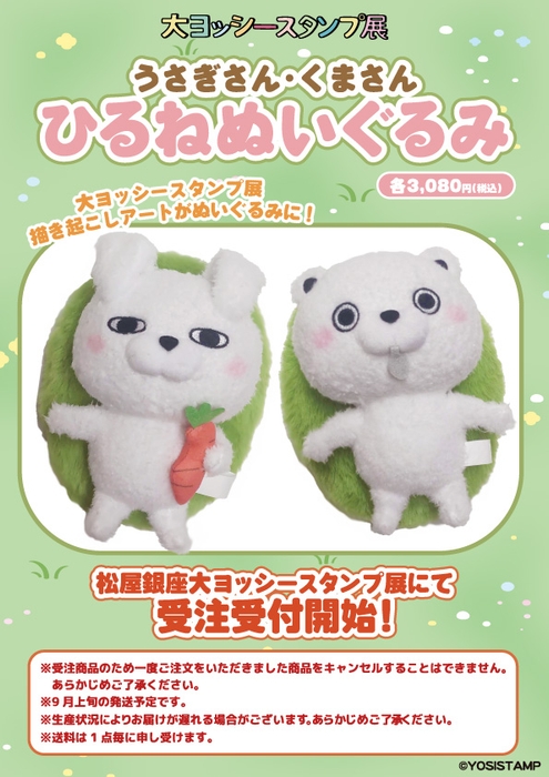 今回の大ヨッシースタンプ展に向けて描き起こしされたイラストから飛びだしたようなくまさんとうさぎさんのぬいぐるみも受注受付いたします。