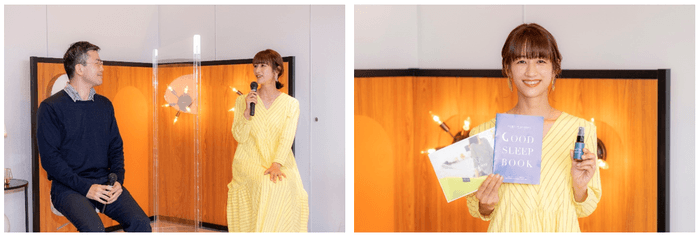 また、前田さんのお話の中にも出てきた“香り”について、椎野は「香りには、ラベンダーやカモミールなどの鎮静作用があるものと、ジャスミンやペパーミントなどの覚醒作用があるものがあります。これらは、入眠や朝の起床に劇的な効果をもたらすものではないですが、補助的に使うことで入眠や朝の起床の一助とすることができます。また、有効性の報告があるものとして、スギやヒノキの木に含まれるセドロールという香気成分は、交感神経活動を抑制する作用があります。就寝前~就寝中の吸入で寝つきや中途覚醒の改善に効果があると確認されています。寝室の木質素材が多いほど不眠症状が少ないというデータも報告されていますが、木のほど良い香りによる効果なのかもしれません」と、香りと睡眠の密接な関係性について解説。加えて、会場に設置されたディフューザーには、ラベンダー、ベルガモット、スイートオレンジなどの精油が使用されており、これらの香りは、ストレスを和らげ、感情のバランスを整えてくれる効果があるのだとか。前田さんは「いつも、お風呂に子どもを入れるときにドタバタしてしまいます。そんなとき、自分に振りかければ子どもたちにも優しい気持ちで声かけができそうです(笑)」と、会場を包み込む柔らかい香りについて感想を述べました。