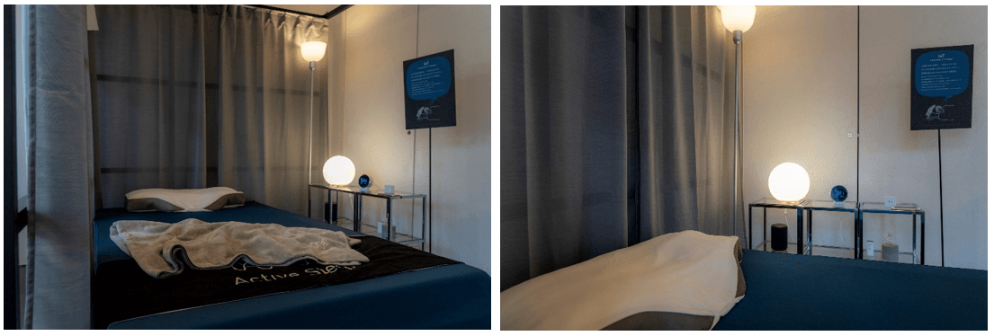 展示は4つのブースにわかれており、すべてのコーナーにおいて、実際に「Active Sleepベッド」を体験することができます。ベッドにはセンサーが搭載されており、呼吸数や心拍数などの体動から入眠・起床を検知。眠りやすさ、寝返りのうちやすさ、起床のしやすさなどを考慮し、その時々によって角度が自動で変化します。また、『読書モード』では読書がしやすい角度を設定できたり、マットレスの柔らかさ・固さの調整も可能。これらはすべてスマートフォンアプリで管理でき、自身の好みによって細かくカスタマイズができるようになっています。