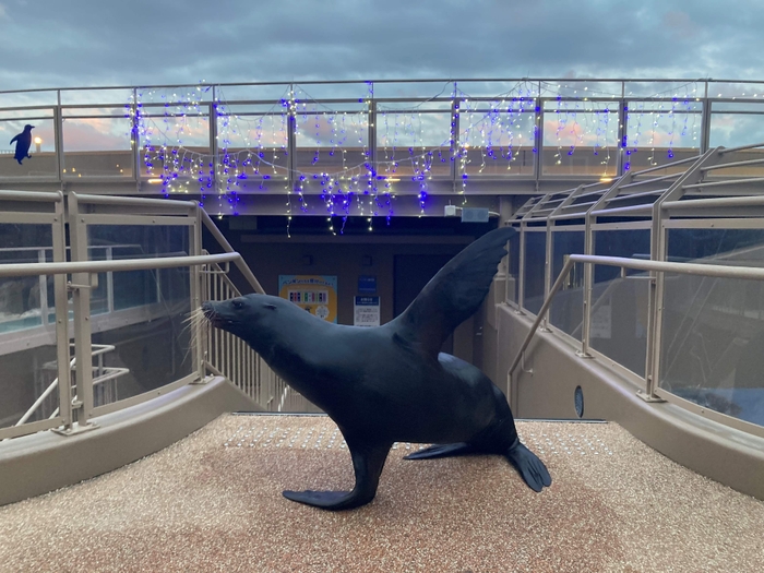 今年3月にリニューアルオープンした「オーシャンテラス」にて、カリフォルニアアシカによるイルミネーション点灯式を期間中毎日開催いたします。オーシャンテラスのバルコニーに設置されたドーム型のメインオブジェとイルミネーションがアシカの合図とともに一斉に点灯し、太平洋をバックにバルコニーが暖かな光に包まれます。