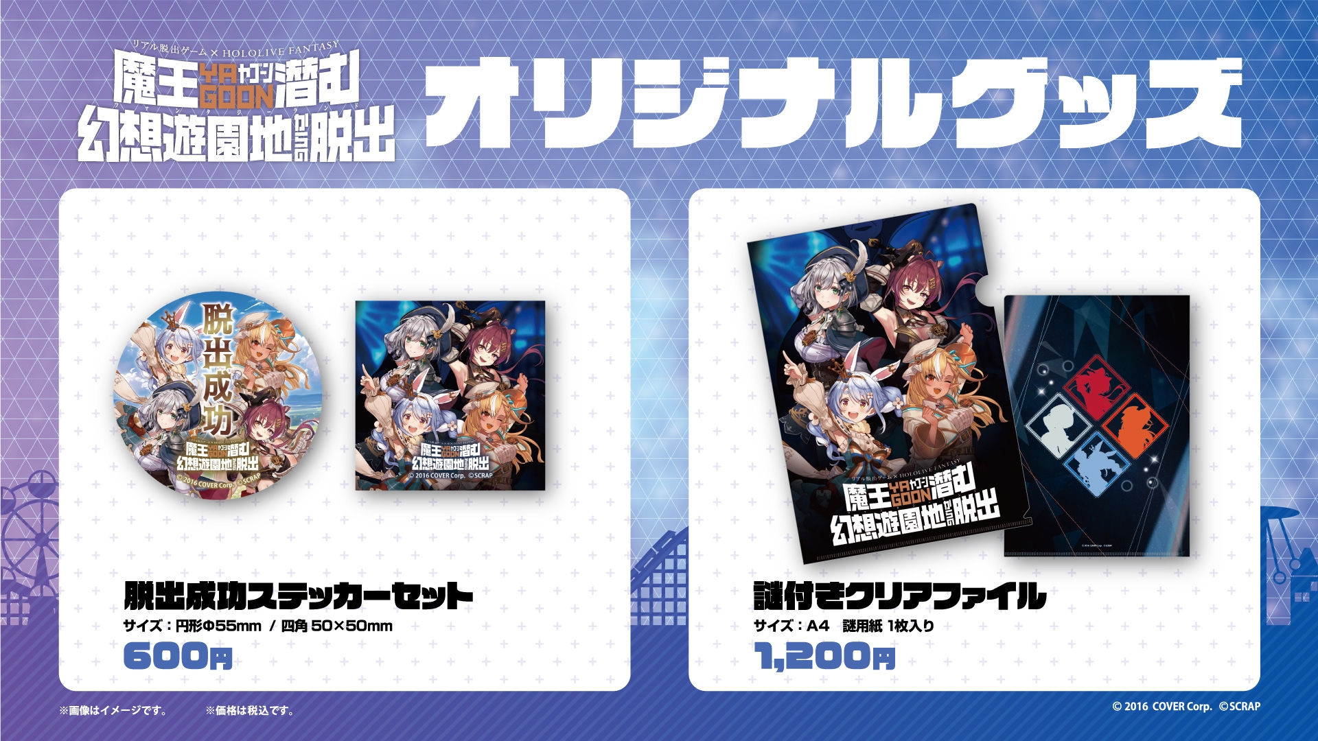 また、この描き下ろしイラストをあしらった『魔王YAGOON潜む幻想遊園地からの脱出』オリジナルグッズ2種の販売も決定いたしました。「脱出成功ステッカーセット」は、イベント参加の記念に最適な1品。「謎付きクリアファイル」はクリアファイルとしての利用はもちろん、おうちでもHOLOLIVE FANTASYにちなんだ謎解きが楽しめる商品です。