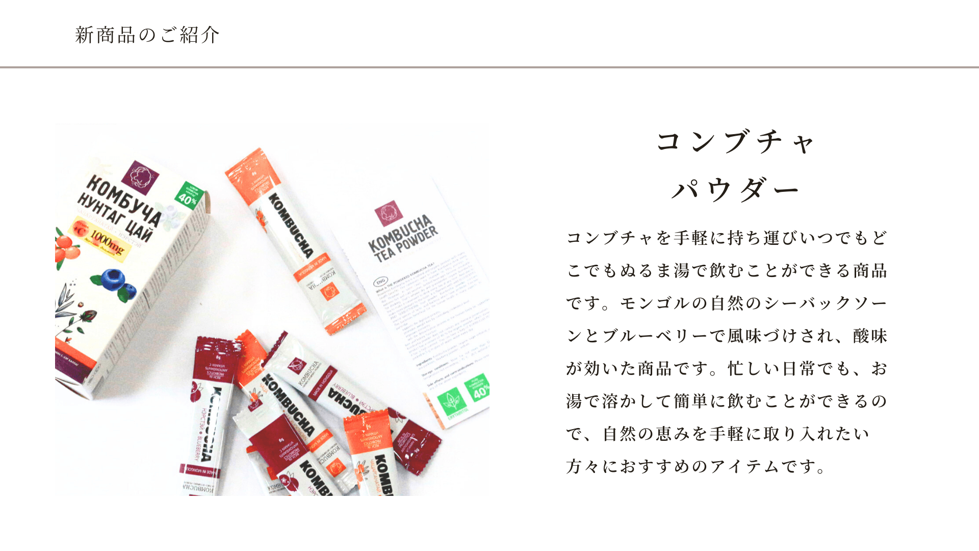 コンブチャを手軽に持ち運びいつでもどこでもぬるま湯で飲むことができる商品です。モンゴルの自然のシーバックソーンとブルーベリーで風味づけされ、酸味が効いた商品です。忙しい日常でも、お湯で溶かして簡単に飲むことができるので、自然の恵みを手軽に取り入れたい方々におすすめのアイテムです。