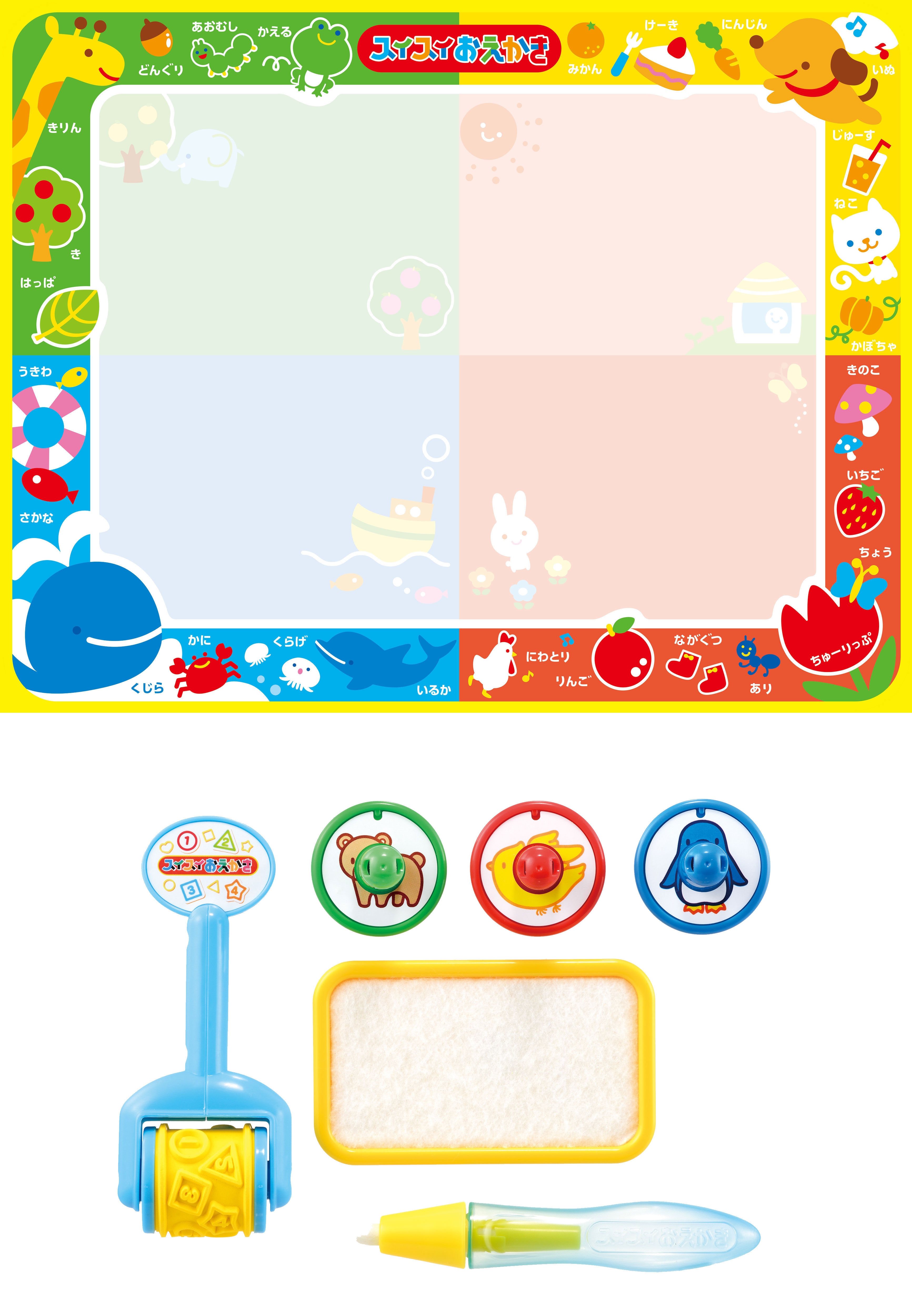 「スイスイおえかき」は、お水のペンで周囲や家を汚さずのびのびおえかきができて、乾くと消えるから何度でも繰り返しあそべるロングセラーおえかき玩具です。2000年に販売がスタートし、「2016年日本おもちゃ大賞エデュケーショナル・トイ部門」や「2019年日本おもちゃ大賞イノベイティブ・トイ部門」を受賞しています。2003年から海外輸出がスタートし、今では50か国で販売しています。アメリカ・イギリス・ドイツなどで、すぐれた知育玩具に贈られる「トイ・オブ・ザ・イヤー」を受賞し高い評価をいただいています。