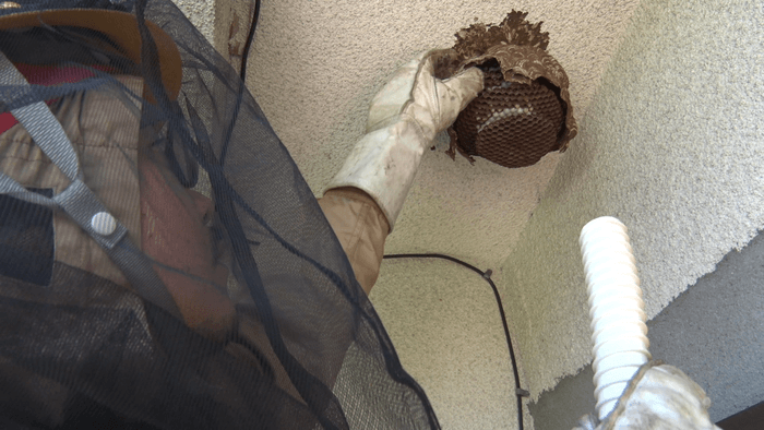依頼先の山梨県甲州市の住宅を訪れた望月さん。2階の軒先に巣がぶら下がっていました。数種類いるスズメバチの中でも警戒心が強く、凶暴性も高いキイロスズメバチ。巣はこのまま放っておくと3倍にも大きくなる危険な状態です。