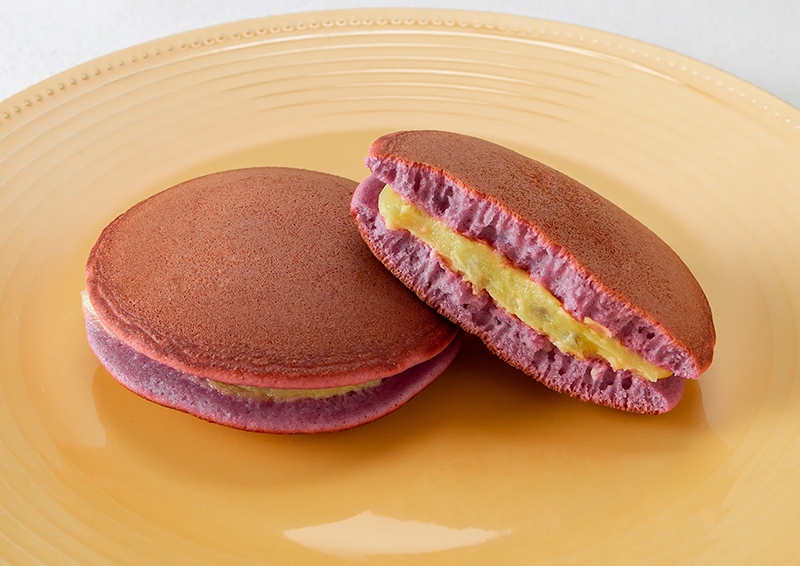 『秋芋どら焼』の餡は、白餡をベースにしたさつま芋の餡に、クリームを入れて軽やかな口当たりに仕上げています。さらに、カットしたさつま芋を練り込むことで、素朴でやさしい甘みと食感をお楽しみいただけます。皮には紫芋パウダーを練り込み、ふんわり焼き上げ、鮮やかな紫色に仕上げることで、芋クリーム餡との色合いのコントラストが美しい、見た目にもこだわった一品です。