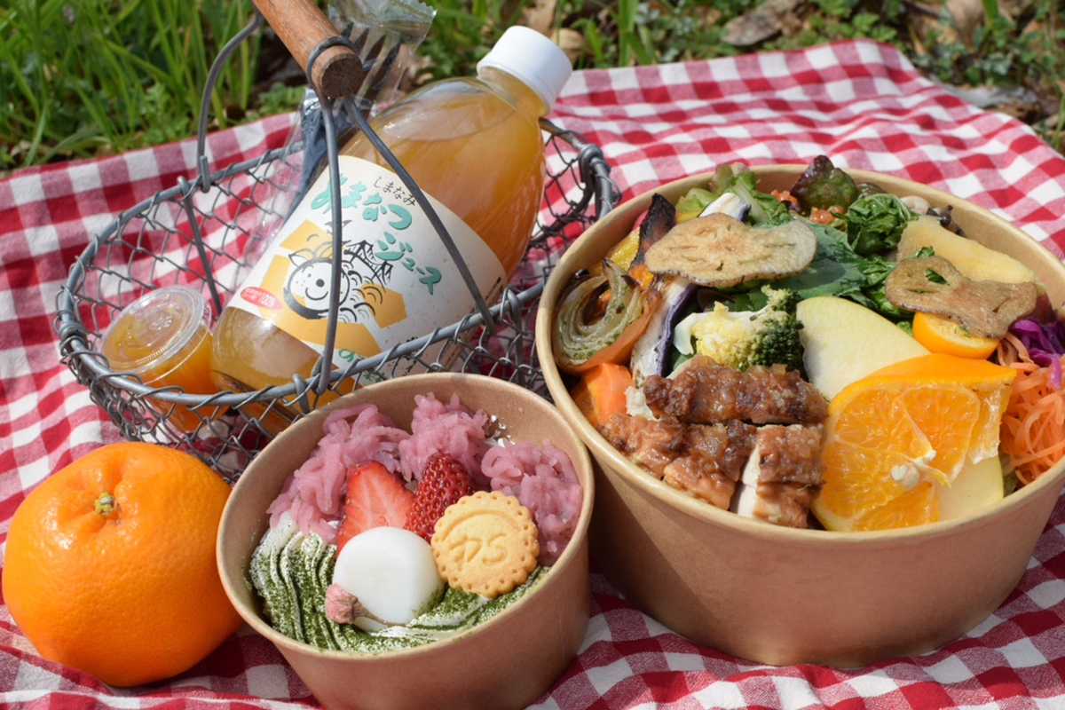 メインとなるサラダBOXに、デザートはお花見にぴったりな春うららシフォン(シフォンケーキ×クリームに苺や桜モンブランがのったカップデザート)、さらに季節のフルーツ(はるみオレンジ)とジュースがついたお得なセットです。