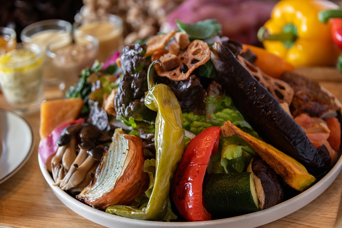 生野菜だけでなく四季折々の野菜のグリルやマリネも盛られており、そのボリューム感でいつもお客様を驚かせています。女性だけでなく野菜が苦手な男性やお子様からも「ここの野菜は美味しい、沢山食べられる」というお声がよく聞かれます。