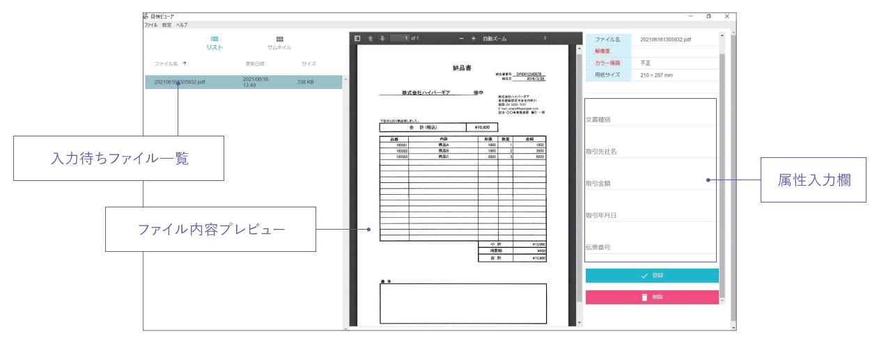 確認しながら文書種別や取引先名など、必須項目を入力することができます。 - 「Entry Tool」は、各項目に最適な入力補助機能を備え、