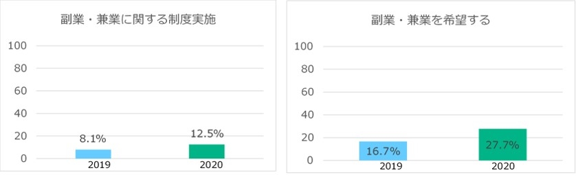 さまざまな雇用形態・業職種を対象とした調査によると、勤務先で「副業・兼業に関する制度導入」が実施されている人の割合は、昨年から4.4ポイント増加し、今年は12.5%。また正社員のうち、副業・兼業を希望する人の割合は、昨年から11ポイント増加して今年は27.7%と副業・兼業についての注目が高まっています。