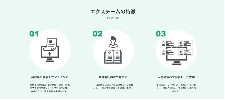 エクスチームは、「社員もフリーランスも、ワンチームで活躍する組織を広めていく」ことをミッションに、外部人材を活用している企業を対象に業務委託先をリスト化し、発注から請求までを一元管理できるサービスです。